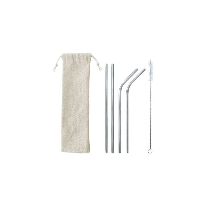Set de 4 popotes de acero inoxidable con cepillo para lavarlos. Se entregan en bolsa de yute.