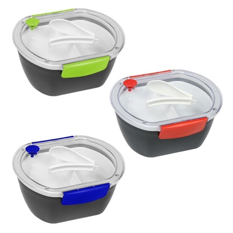 Contenedor para alimentos base en color negro fabricado en as, tapa translucida de silicon con accesorios de colores y compartimentos con cuchara.